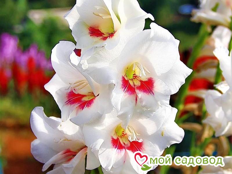 Читать далееГладиолус Карин (Carine) Растение с нежными цветами белой окраски и фиолетовой серединой. Высота растения колеблется от 45 до 60 сантиметров. Оптимальная почва: хорошо дренированная, мульчированная. Особенности ухода: хороший полив, но без застоя воды, применение микроудобрений, рыхление почвы, прополка сорняков. Особенности размножения: детками, образующимися вокруг клубнелуковиц. Возможно и семенное размножение для выведения новых сортов. Применение: в ландшафтном дизайне для создания уютных красивых дворов, в садах. Из них собираются невероятно шикарные букеты.